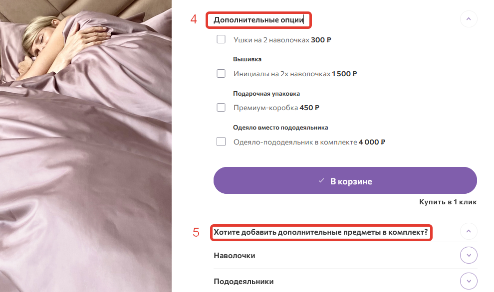 Пункт "Дополнительные опции" (#4) позволит добавить к комплекту ушки к наволочкам, вышивку, премиальную коробку и даже опцию "одеяло-пододеяльник" (для вашего удобства мы установили единую цену за стежку одного пододеяльника 4000 р. вне зависимости от размера - пока не везде добавили эту опцию, в процессе).