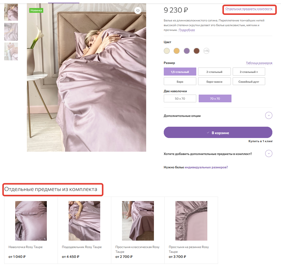 К любому комплекту или предмету белья вы можете добавить дополнительные предметы прямо из карточки через раскрывающийся список "Хотите добавить дополнительные предметы в комплект?" - пункт #5.