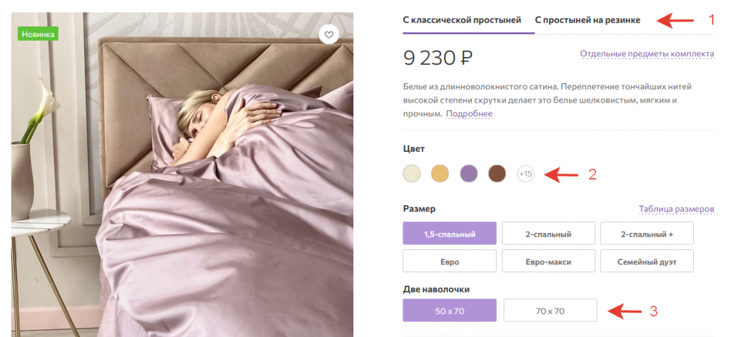 В карточках белья мы усовершенствовали "переключалку" на комплекты с резинкой - переходите на вкладку "комплект с простыней на резинке" (пункт #1 на схеме) или сразу заходите в соответствующий раздел - в меню все комплекты мы разделили на комплекты с классическими простынями и простынями на резинке.
