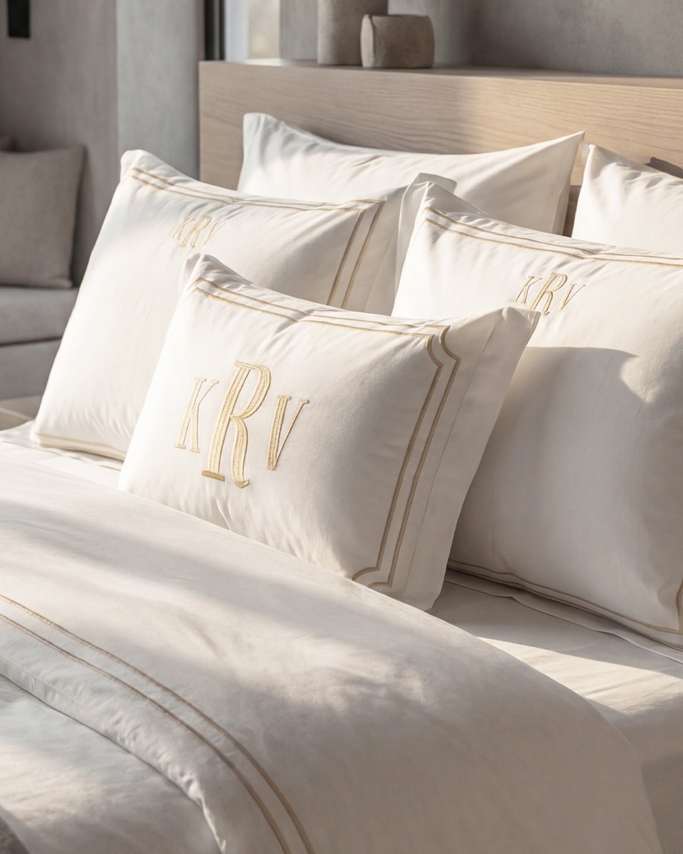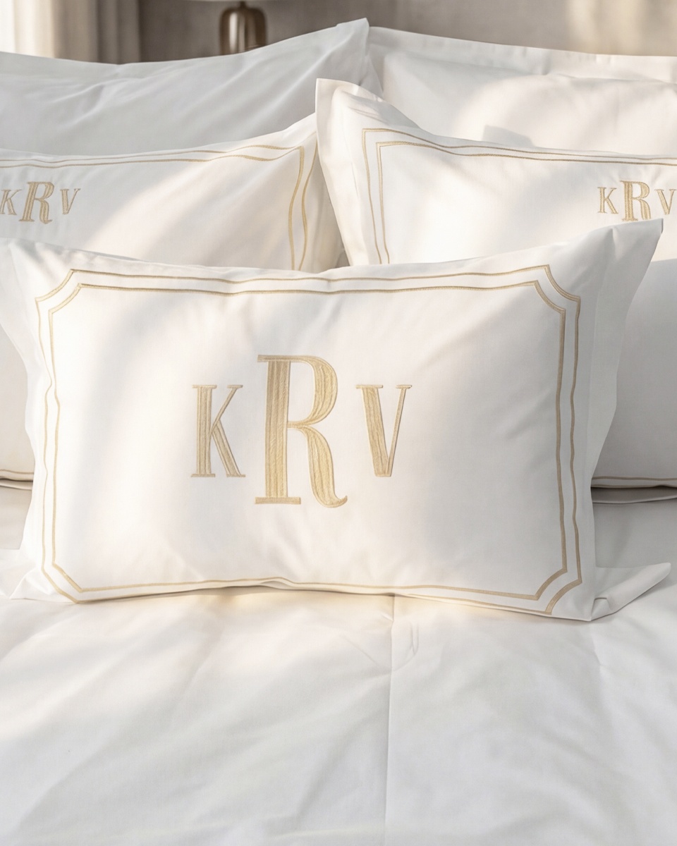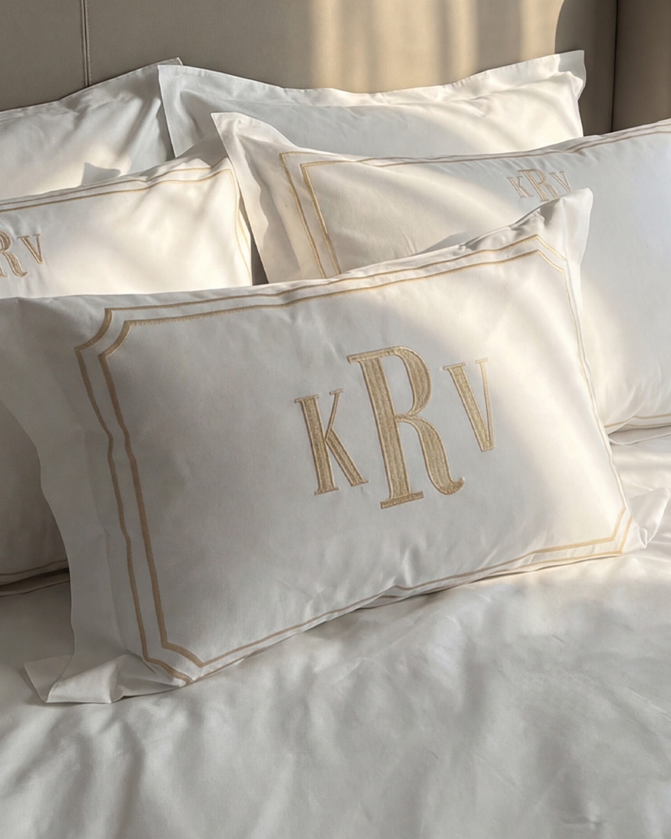 Декоративная наволочка из длинноволокнистого сатина с личной монограммой. Наволочка декорирована атласными отстрочками-вышивками в виде двойных рамок с обычными или скругленными уголками.