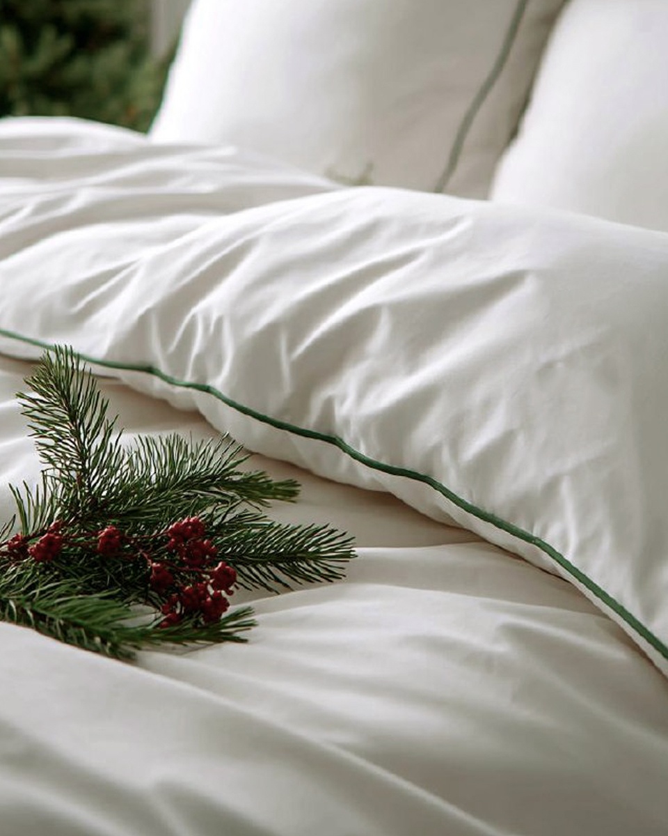 Комплект исполнен на белоснежном сатине и украшен контрастными зелеными кантами.