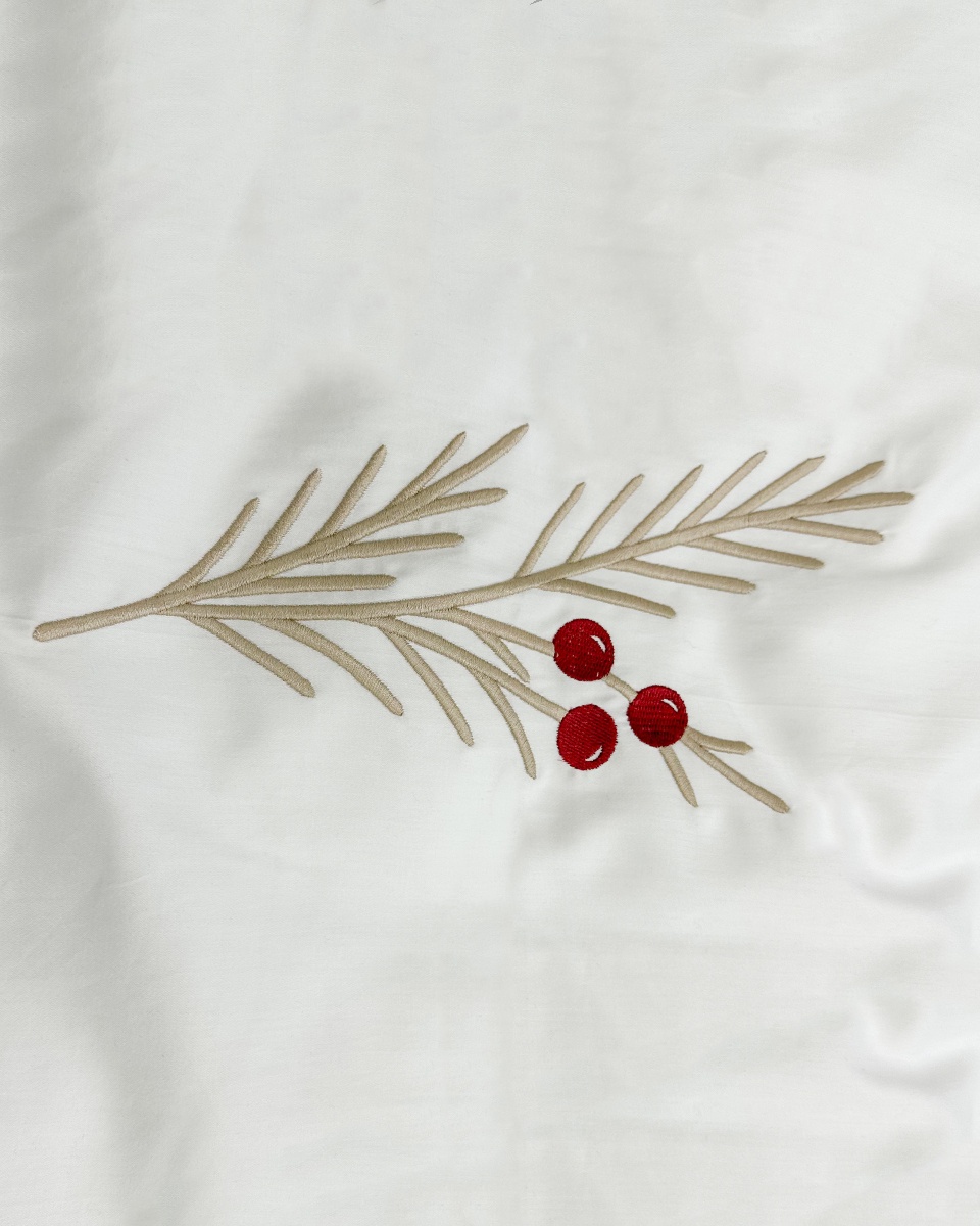 На наволочках - изящные вышивки лошадей в бордовом контуре с золотистыми прядями. На пододеяльнике золотистая ветвь с бордовыми ягодами.