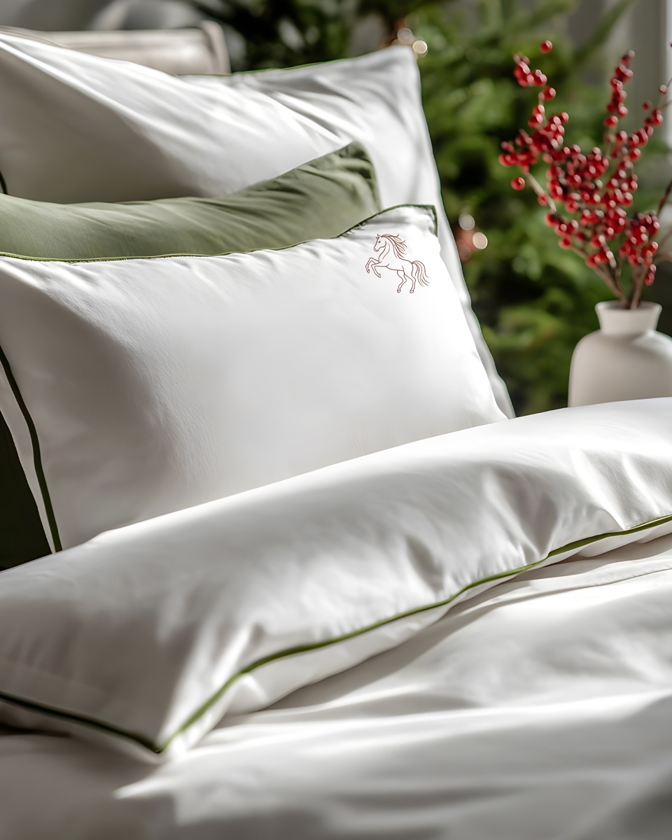 Новогоднее постельное белье с символом 2026 года Красной огненной лошадью. Лаконичный комплект в эстетике минималистичной роскоши, что позволит наслаждаться им круглый год.